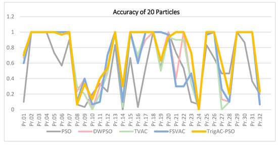 Accuracy of PSO, DWPSO, TVAC, TrigAC-PSO and FSVAC for 20 particles.