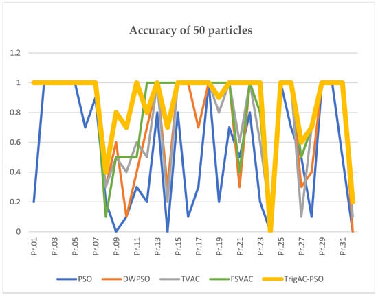 The following table (Table 10) and Figure 5 present the accuracy for the 50 particles. The accuracy for each PSO variation is as follows: Classic PSO, 52.5%; DWPSO, 74.3%; TVAC, 76.56%; TrigAC-PSO, 86.88%; and FSVAC, 82.19%. The two new variations range at the highest levels. These are particularly promising results, demonstrating that the increase in the particle’s number leads to an increase in the PSO variation’s accuracy, especially in the case of TrigAC-PSO and FSVAC. The results of 50 particles are equal to or better than the results that are currently presented. Overall, TrigAC-PSO was the one that obtained the most robust results.