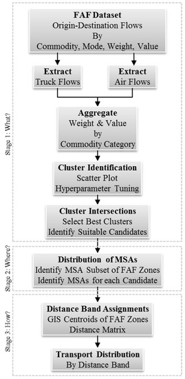 The methodology to answer the research questions included a three-stage data mining and GIS workflow. Each stage applied data filters to (1) identify truck and air commodity demand clusters and their intersections, (2) recognize the regional demand distribution for the selected commodity clusters, and (3) determine a truncated distribution of geodesic distance bands suitable for cargo EAAs among the selected regions. Figure 1 illustrates the three stages as “What”, “Where”, and “How” in terms of what commodities to target, where to initiate service, and how to select the origin–destination pairs from the subset based on distance constraints, respectively.