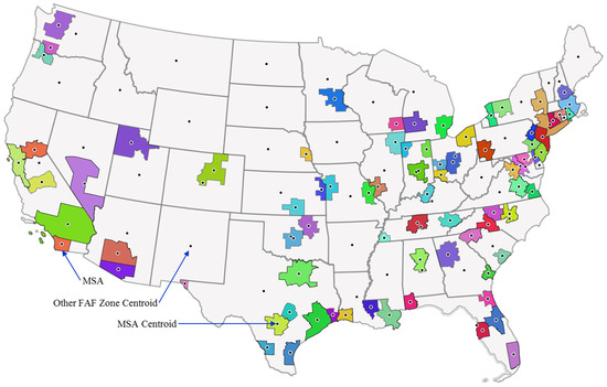 To determine the area of the FAF zone, a GIS algorithm dissolved all CONUS counties within a FAF zone with the land and water areas. The algorithm used the GIS shapefile from the USCB TIGER® database, which contains both the land and water areas of all U.S. counties [52]. The algorithm used the USCB 2017 commodity flow survey geographies database, which contained a FAF zone identifier for each U.S. County [53]. The workflow merged the TIGER® shapefile with data from the FAF geographies database by using the federal information processing (FIP) code for each county as the merge key. The CFS07_DDESTGEO field of the FAF geographies database matched the FAF zone codes except for 16 of them, which the author discovered by iterating the merging procedure and identifying missing values. Table 3 summarizes the FAF zone code revisions needed to complete the merge. Figure 2 illustrates the final GIS dissolve that resulted in 83 MSAs and 46 other FAF zones, along with their geospatial centroids. The assorted colors in the figure serve only to help more clearly distinguish between the regions and, particularly, adjacent regions.