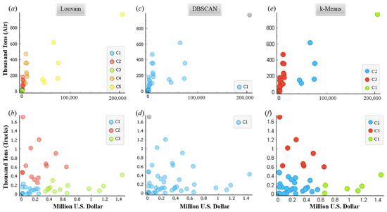Figure 3 shows the results from the three clustering algorithms. The first and second rows of the figure are weight–value scatter plots for air and trucks, respectively. In the air analysis, Louvain and k-means discerned similar points in cluster 5 (C5) and cluster 2 (C2), respectively, except for one noticeable outlier in the top right of the chart. For trucks, Louvain and k-means agreed on some points within cluster 3 (C3) and cluster 1 (C1), respectively. DBSCAN tended to isolate the outlier and cluster the remaining points together. Overall, k-means clustering provided the most logically attractive groupings of high-value, low-weight and low-value, high-weight commodities.