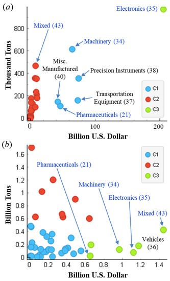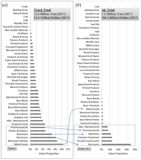 K-means clustered high-value, low-weight commodity categories transported by (a) air and (b) using trucks.