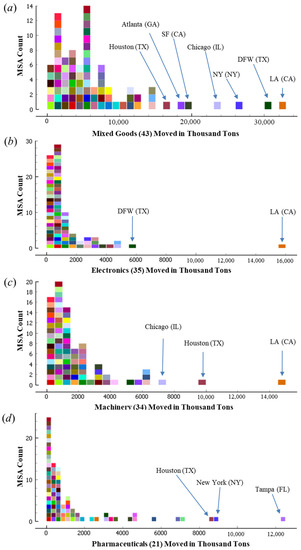 Figure 6 shows the MSA distribution by weight moved in thousand tons (KTons) for each of the four commodity categories selected in the previous stage of the data-mining workflow. Each colored box represents an MSA. The figure presents the outlier MSAs for the movement of commodity categories using trucks. Trucks in the Los Angeles (LA), California (CA), MSA transported the majority of the top three commodity categories by a significant margin.