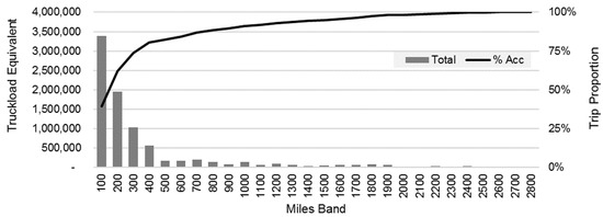 Figure 7 shows the distribution of truckload equivalents across all distance bands. In summary, truck transport within 100 miles accounted for 39.3% of the truckload equivalents for the four selected commodity categories. The accumulated proportion (% Acc) moved was 80.5% within a 400-mile distance band. Hence, 400 miles represented a point of diminishing returns for transporting those commodities by air. Current projections based on the anticipated improvements of battery technology suggest that cargo EAAs will exceed those ranges well before 2050 [26].