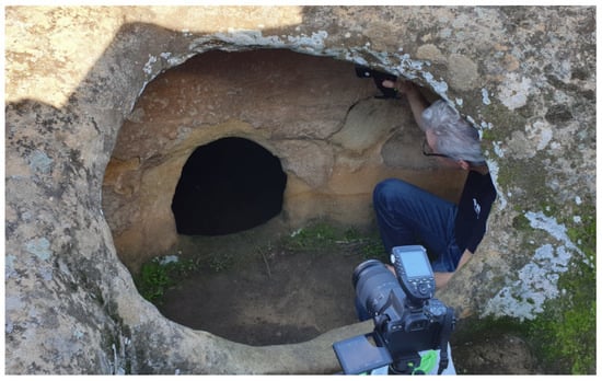 For example, the bas-relief displayed in Figure 1 is found in the Domus de Janas of Corongiu, in Pimentel (South Sardinia, Italy), dated 4th millennium BC. Figure 2 shows the small lobby where the engraving is located. While the camera can be placed sufficiently far from the rock surface, it is impossible to illuminate it with a flashlight at a distance suitable for proper lighting. Moreover, measuring with precision the position of the light source relative to the engraving is very difficult. This situation is common in many archaeological sites.