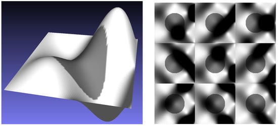 We initially apply the two methods to a synthetic dataset, first considered in []. The analytical expression of the observed surface, displayed in the left-hand pane of Figure 3, is fixed a priori, and a simple white and gray image is texture mapped to it. The synthetic images are obtained by applying the PS forward model to the surface. The images displayed on the right of Figure 3 were produced by choosing a set of nine lighting directions. In this case, the light sources were located at an infinite distance from the target, but the model allows choosing the lighting distance using the width A of the domain (see (1)) as a unit of measure.