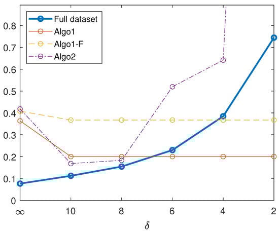 where , is the model surface, and is the reconstruction obtained by processing the whole dataset, where the third light source is at distance . The other three lines represent the error obtained by processing a reduced dataset, according to the recommendation of Algorithm 1 (Algo1), the fast version of the same method (Algo1-F), and Algorithm 2 (Algo2).