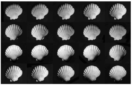 While the first experiment was concerned with the case of a perfect Lambertian reflector illuminated by a close light source, in the second one we investigate the case of a non-Lambertian surface with lights at almost infinite distance from it. The Shell3 dataset, displayed in Figure 5, was used for the first time in []. A preliminary version of the dataset has been considered in []. The pictures were obtained by placing a seashell, approximately 10 cm wide, on a rotating platform in the open air. The same platform holds a tripod with a camera observing the shell from above, at a distance of about 1 m (see []). Twenty images were taken by letting the platform rotate clockwise under direct sunlight.