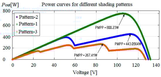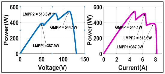 In this case, the details of irradiance levels received on the modules in Pattern-1 and their P-V and P-I plots are discussed and presented in Figure 9. The voltage and current at GMPP under this shading condition are 544.12 W, 114.008 V and 4.7771 A, respectively.