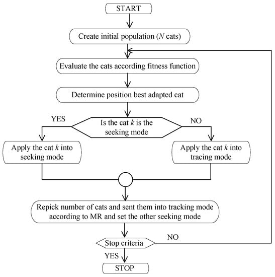 Each cat’s size in the search pool is determined by the SMP value, which translates the points needed by the cat. SRD announces the boundary condition requirement for updating the dimensions as well as the Mixture Ratio (MR) of the preferred dimensions. The CDC is a key element of the searching mode that reports how many dimensions need to be modified. The SPC value plays a crucial role in determining whether the current candidate of the virtual cat can be deemed as a suitable choice within the search memory. The flow chart interpreting the CSO algorithm is shown in Figure 2. The sequential procedure involved in the Seeking approach is presented below.