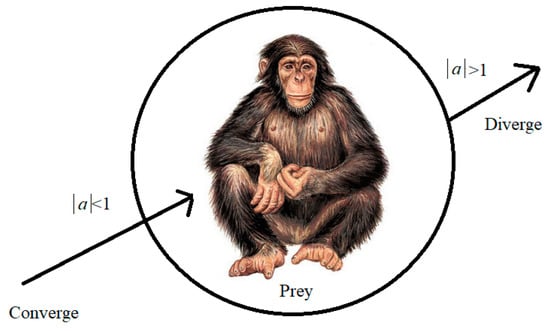 The mathematical model represents the attack process, where the value of f decreases linearly from 2.5 to 0. This linear reduction enhances the effectiveness of the attack and the exploitation of the prey’s location. To enhance the attacking and exploitation of the prey location, the mathematical model employs a linear reduction of the value of f from 2.5 to 0, representing the process of attack. Further, the scope of the vector is found to decrease like that of function f. The described vector is random within the range of −2f and 2f. All the time, a random value is selected for the vectors stretch-out within the range of [−1 and 1], and the value determines the next placement of the chimp, which can be at any location within the available position and conditions of the prey. Although there is mention of projected blocking, chasing and driving mechanisms that highlight the searching limits, there is a concern that the algorithm referred ChOA may get trapped in nearby minima. To address this, an additional operator is deemed necessary to enhance the searching ability during the exploitation period. In this approach, all the chimps embark on hunting the prey, as depicted in Figure 5. The value of “a” coefficient is mathematically modelled to align with the hunting behaviour. Consequently, the disparity among the chimps compels them to wander in pursuit of the prey, ultimately driving them to converge at the location of the prey.