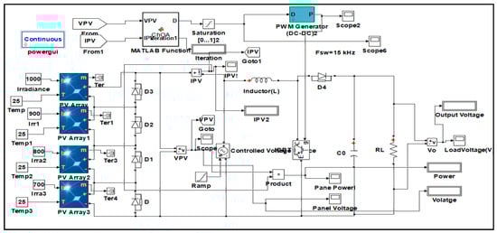 The performance of the PV string is evaluated under partial shading conditions for three cases considering three different shading patterns as shown in Table 2, using various optimization-based MPPT techniques. Figure 8 represents the simulation circuit of four series-connected PV modules by varying the irradiation levels, temperature at 25 °C with the PV module and converter circuit details listed in Table 3.