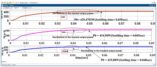 According to the simulation findings for Pattern 1 displayed in Figure 10, Figure 11 and Figure 12, the ChoA shows reduced oscillation during the MPP search process. Specifically, when shading occurs, the PV module power output rapidly converges to the MPP with very minimal fluctuations. However, based on the simulation results depicted in Figure 10 (Simulation results using CSO for Pattern-1), Figure 11 (Simulation results using GWO for Pattern-1) and Figure 12 (Simulation results using ChOA for pattern 1), the average convergence time of the GWO algorithm is relatively high. Even though the suggested chimp algorithm converges sufficiently quickly and catches only after a short period, the ability of ChOA, GWO and CSO algorithms to chase the GMPP under various shading situations is examined. It is observed from the simulation result that the output power obtained from the PV array using CSO is 521.41 W, using GWO is 527.44 W, and 531.198 W when ChoA is used.