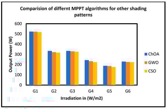 ChOA, GWO and CSO algorithms are simulated in MATLAB/SIMULINK to validate their expected performance under various partial shade patterns (G1 to G6). Table 5 lists the outcomes of the statistical simulation. The variable power output with irradiation with different MPPT techniques under other shading patterns is presented in Figure 14. From Figure 14, G1 shading pattern will produce the solar photovoltaic system’s highest power. Due to its speed and confidence, the simulation results of the various shading situations showed that ChOA performed better than other optimization strategies under partial shading settings. The summarization of statistical simulation results like power, voltage and current of the PV module under other partial shading conditions is presented in Table 5.