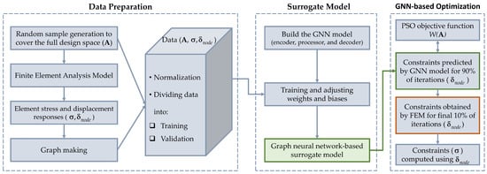 - Data Preparation. Generating a dataset of trusses with their members assigned a random sample set of cross-sectional areas, , which is then analyzed and transformed into graphs to be used as input to the GNN for training and validation.