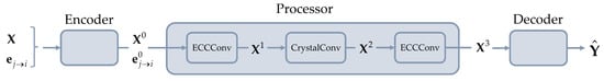 - CrystalConv is a Crystal Convolution layer introduced by Xie and Grossman [52]. This layer computes:where concatenates neighbor vectors with the features of the connecting edge. Meanwhile, indicates an element-wise multiplication; denotes a sigmoid function; and is an activation function defined by the user. In this work, summation pooling and ReLU are used as the pooling and activation functions, respectively.