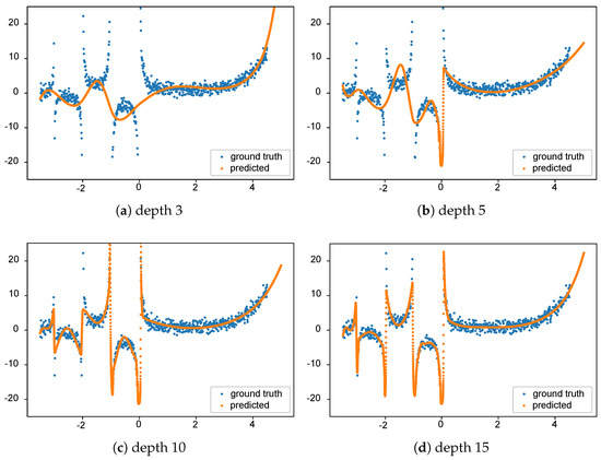 Examples of the fit obtained by the Spline Continued Fraction using a dataset generated thanks to the gamma function with added noise. We present several continued fractions with depths of 3 (a), 5 (b), 10 (c), and 15 (d). In this example, the number of knots k was chosen to be 3, = 1, and = 0.1.