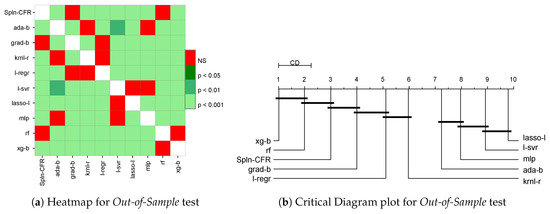 We applied Friedman’s post hoc test on the ranking of the ten regressors computed for the RMSE scores obtained for 100 runs of the Out-of-Sample test. In Figure 2a, the p-values obtained for the test are plotted as a heat map. It can be seen that there exist no significant differences (NS) between the performances of Spline Continued Fraction (Spnl-CFR) and those of rf and grad-b.