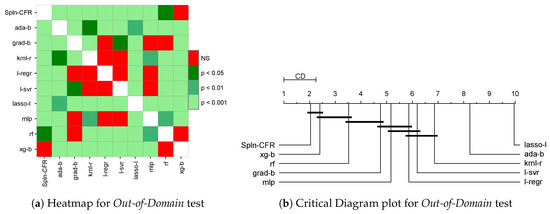 The p-values obtained for the post hoc test are plotted as a heat map in Figure 3a for the Out-of-Domain test. It can be seen that no significant differences (NS) exist between the performance of Spline Continued Fraction (Spnl-CFR) and those of Random Forest (rf) and XGBoost (xg-b). There is no significant difference between the performance ranking of Linear Regression (l-regr) and those of mlp, l-svr, krnl-r, and grad-b.