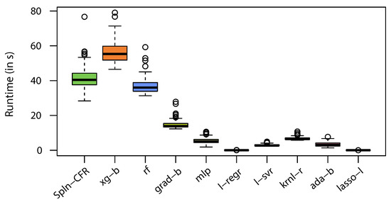 Figure 4 shows the running time (in s) required by each of the regression methods for 100 runs of the Out-of-Domain test. It can be seen that the lowest required running times are for Linear Regression, with a 50th percentile runtime of 0.02 s and maximum of 0.158 s, and Lasso Lars, with a 50th percentile runtime of 0.013 s and maximum of 0.027 s. XGBoost (xg-b) required the longest time (50th percentile runtime of 55.33 s and maximum 79.05 s); on the other hand, Random Forest and the proposed Spline Continued Fraction regression required very similar times (50th percentile runtimes of 36.88 s and 41.65 s for rf and Spln-CFR, respectively) on the Out-of-Domain test.