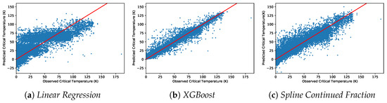 Figure 6 shows the actual versus predicted critical temperature for the Out-of-Domain test for the Linear Regression, XGBoost, and Spline Continued Fraction models. Recall that in the Out-of-Domain test settings we trained each of the models with the samples from the bottom 90% of the observed temperature, which is < 89 K, and measured the samples’ test performance using the top 10% of the observed critical temperatures, with 2126 samples in the test set.