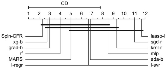 Additionally, we generated the Critical Difference (CD) diagram proposed in [21] to visualize the differences among the regressors for their median ranking. The CD plot uses the Nyemeni post hoc test and places the regressors on the x-axis of their median ranking. It then computes the critical difference of the rankings between them and connects those which are closer than the critical difference with a horizontal line, denoting them as statistically ‘non-significant’.