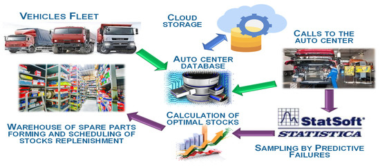The proposed method is also complemented by service centers’ data collecting and processing system. With continuous forecasting of the need for service centers in spare parts, a mechanism for monitoring system parameters is needed to correct trends in the process of customer service. A necessary condition is the presence of a database that is stored in the cloud storage, where data on vehicle requests from service centers of the entire branded network of an automotive enterprise are collected (Figure 1). These data are used to form samples of predicted failures for each item group. On the basis of the obtained probabilities of needs, warehouse and replenishment schedules are formed.
