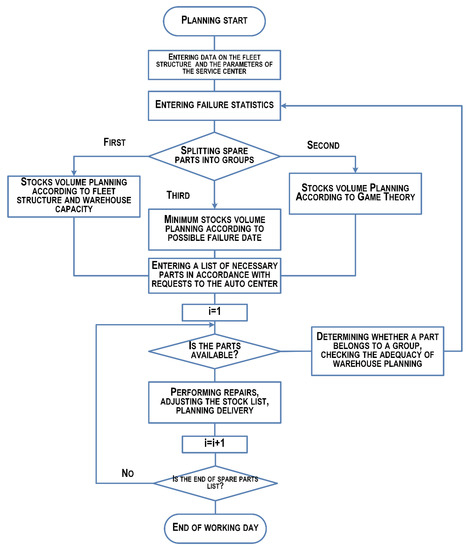 In addition, it is known that when making engineering, managerial, and other decisions, there is no complete information about the system state, external conditions, and consequences of the decisions made. Thus, studies show that 80% of decisions are made with only 20% of information about the controlled system and the factors acting on it [2,3]. In the problem of planning a spare parts warehouse, an example of conditions of uncertainty at road transport enterprises is to determine the number of possible requirements for a specific type of vehicle repair during “tomorrow”, the possibility of working, or the absence of a specialist or worker. Complete information in such cases can be obtained only after the occurrence of one or another event, when the need for a proactive decision has disappeared, and the system has switched to reactive control mode. Therefore, when managing, it is necessary to be able to fill in or compensate for the lack of information in one way or another. Properly planned organization of an automotive service enterprise’s warehouse stock operation cannot do without scientific methods of analysis. One of the decision-making methods in conditions of information deficiency is the analysis of the market, and production situation using game theory and statistical decisions.
