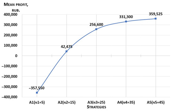 The results obtained for the change in profit depending on the stock of starters in the warehouse (strategies A) are shown graphically (Figure 3).