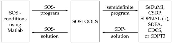 with a positive semidefinite matrix Q and a vector  consisting of all monomials up to degree  []. The search for a positive semidefinite matrix Q can be transformed into a semidefinite optimization problem []. Efficient tools exist for solving such semidefinite programs: SeDuMi [], CSDP [], SDPNAL [], SDPNAL+ [], SDPA [], CDCS [], or SDPT3 []. The transformation of a SOS problem into a semidefinite program is possible with the toolbox SOSTOOLS under MATLAB (see Figure 1). For this purpose, the respective conditions formulated with SOS polynomials are defined under MATLAB. These can subsequently be transformed into a semidefinite program using SOSTOOLS. This program can then be solved with one of the previously mentioned tools. The solutions obtained in this way are thereupon transformed into the solution of the original SOS constraints by SOSTOOLS. Through this interaction of the individual tools, an efficient solving of SOS programs is possible.