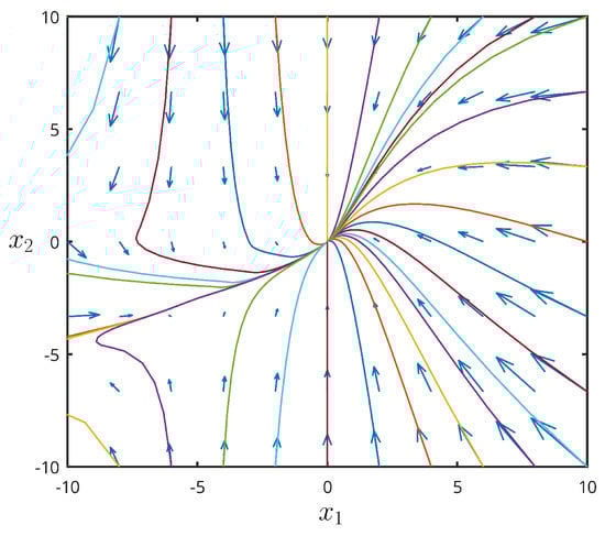 The cubic polynomial appearing in this expression has the real roots , , and . Thus, for , the condition (70) is satisfied. Hence, in this admissible parameter interval (66) is a control Lyapunov function. The equilibrium  of the system (65) can therefore be stabilized, for example, with feedback (53). Figure 3 shows the phase plane of the controlled system, where the parameter  was used for the control Lyapunov function.