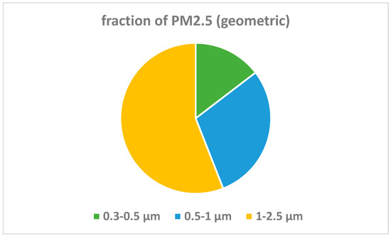 An advantage in using equations of the general form of Equation (2) above is that it allows an estimate of the contribution made by each size category to the total mass (PM2.5). For example, typical values of N1, N2, and N3 occurring in a Santa Rosa home were determined from a full-year dataset from 1 January 2021 to 31 December 2021. These are entered into Equation (4) to determine the fractional contribution of each bin to total PM2.5 during this period (Table 3 and Figure 1).