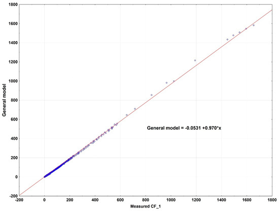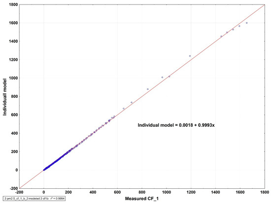 Regression of individual model against measured PM2.5 using the CF_1 algorithm. The R2 was 0.9994.