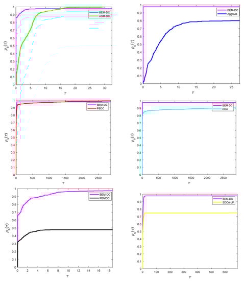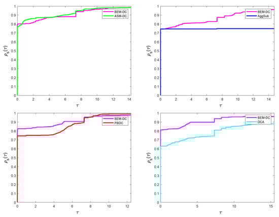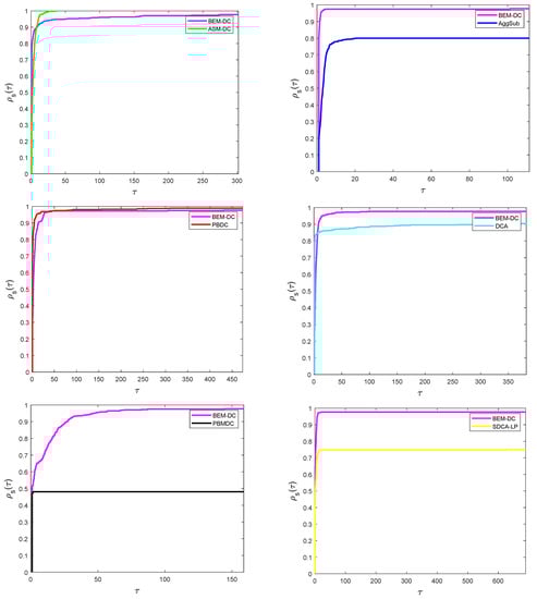 Performance profiles using the number of function evaluations, the number of subgradient evaluations, and the computational time (CPU time) required by algorithms are depicted in Figure 1, Figure 2 and Figure 3. Here, we use results obtained by solving Problems 1–9 and 11–14 with 20 random starting points. We report the pairwise comparison of performance profiles as per the note by []. The comparison with other methods shows that the BEM-DC is more efficient and robust than the AggSub, DCA, PBMDC, and SDCA-LP methods. Compared with the ASM-DC method, we can see that the BEM-DC uses significantly fewer subgradient evaluations, and the performance of these two methods are similar concerning two other measures. The performance of the BEM-DC and PBDC methods are similar for the number of function and subgradient evaluations; however, the BEM-DC is more efficient than PBDC if one uses computational time. One reason for this can be the fact that the BEM-DC better manages the bundle of the second DC component than PBDC and decreases the number of the solving of the quadratic programming subproblems required to find search directions.