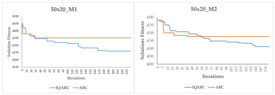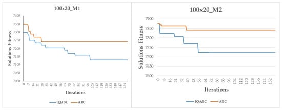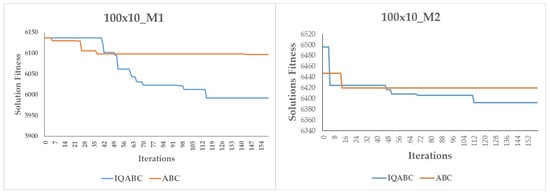 In the proposed IQABC algorithms, a QL algorithm is used to guide the choice of the neighborhood structures in the employed bees phase. The states of the QL model are defined by the set of population individuals, while the six neighborhood structures indicate the set of actions. At each iteration, the QL agent observes the current solution (s), selects an action (a) (a neighborhood structure), which generates a new solution (s’), and consequently, it receives a reward/penalty (r) signal according to the quality of the generated solution (see Formula (6)). The agent records its learning experience by a Q-value (Q(s,a)), which is stored in a Q-table. The update of the Q-value is given in Formula (7), where is the Q-learning rate and is the discount factor.