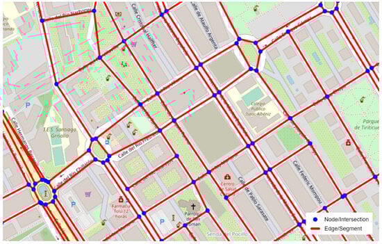 Our data acquisition and integration process is divided into three parts: (1) obtaining the directed graph of segments and intersections and (2) integrating elevation and (3) sequential traffic data. First, we used the OSMnx library [] to generate a basic city graph. Here, each node represents an intersection at any point where three or more segments meet. Each edge represents a segment that connects two nodes following the traffic directions, as shown in Figure 1.