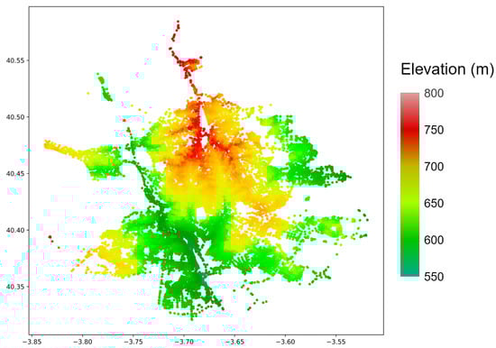 The next step is to assign each node in our graph its elevation value. Since not all our nodes are located precisely on a measuring point, in this case, we have decided to impute the height of the nearest point. Applying complex interpolation methods for grids of elevation values with a resolution of fewer than 10 m is unnecessary, as the results do not show statistically significant differences []. The impute elevation values have a maximum horizontal error of m. Figure 2 presents the elevation map of Madrid, with heights ranging from 550 to 800 m. Finally, we add the slope of each segment, calculated from the elevation values at the source and destination nodes.