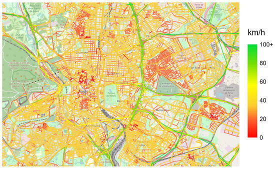 We have generated a heatmap where each segment’s mean speed is calculated from the values from measuring points within an area of effect. In this way, we can obtain a reliable image of the traffic state for each snapshot; see Figure 3. It is worth noting that warmer colors do not necessarily represent traffic jams since the speed mean depends on variables such as weather, speed limits, street widths, number of lanes, or accidents.