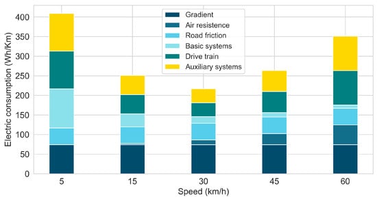 Electric consumption categorized by gradient, air resistance, road friction, basic systems, drive train, and auxiliary systems.