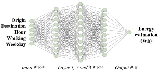 For each obtained route, we recorded the hour of the day, the day of the week, if it is a working day or not, the latitude, longitude, and altitude of both the starting and ending points and the energy cost used to travel along that route. These data points were used to train the model and make predictions based on traffic patterns and the city’s topology. “Hour” and “weekday” are different categories. We divided the data into training and test sets in an 80-20 ratio. The ANN used to predict energy consumption was created using the Keras library for Python. It comprises an input layer of 38 neurons (24 for coding hours, 7 for the day, 4 for coordinates, and 2 for height), and three hidden layers containing 64 neurons each, as shown in Figure 7.