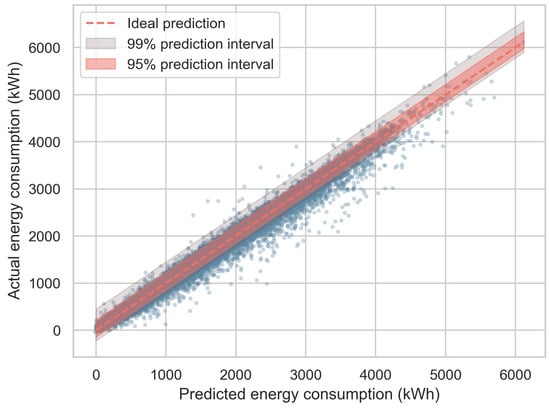 The performance of our ANN was evaluated on the test set, resulting in a root-mean-squared error (RMSE) of 95.1565 and an coefficient of determination of 0.9869. The model’s predictive performance can be visually observed through the scatter plot in Figure 8, illustrating the distribution of predicted versus actual values. The number of samples in the test data is 58,560 routes.