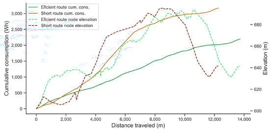 Figure 9 offers a visual representation of how the algorithm optimizes the routes compared to the shortest path solution. The graph includes the elevation profile for both routes. It shows that the energy-minimizing route is longer but has a lower gradient than the distance-minimizing route. The distance-minimizing route consumes the most energy when it takes high-step roads, whereas the energy-minimizing route avoids steep inclines, resulting in a smoother and less energy-intensive path. The incline of roadways, as mentioned earlier, is a significant yet not sole determinant impacting energy consumption. This aspect holds particular significance since EVs can solely recuperate a portion of energy when traversing downhill gradients.