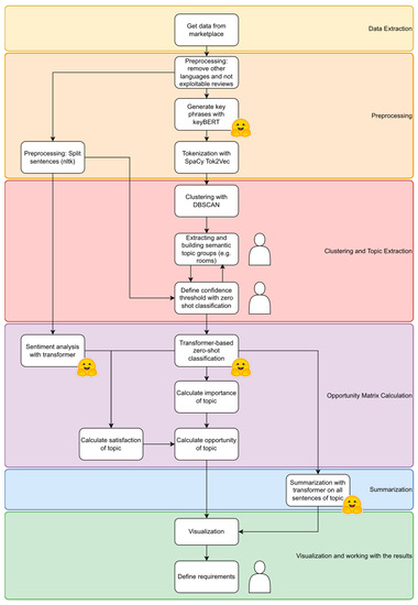 In this section, the proposed methodology is described. It can be divided into six main steps. This flow is shown in Figure 1, with the colored boxes corresponding to the main steps. For steps two and four, we build upon the theory of Jeong et al. [25] while altering the methods used to more state-of-the-art deep-learning methods. Each step in which a transformer is used is marked with a Huggingface logo because we used the current versions available on the Huggingface website. We also highlight the steps in which human action is necessary.