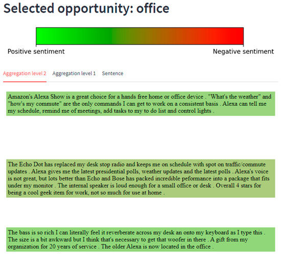A lower aggregation level could be used if more information is needed and more summaries are displayed. As the lowest aggregation level, the sentences should be displayed so that the original written sentences, which are not altered by language transformers, can be read. This summarization adds more insights into the identified topics and their opportunities as formerly known algorithms for requirements elicitation. Considering the success factors (SFs) for requirements change management analyzed in [43], the proposed methodology improves the three top SFs. The most essential SF is changing acceptability. It means the product’s quality depends on satisfying customer needs and expectations. The proposed solution helps to identify the customer needs and expectations from customer reviews. The second SF is updated requirements. All requirements should be updated since the customers’ needs are evolving, and the complete market should also be analyzed. When the proposed methodology is executed periodically, the requirements could be built on the timely needs of the customers. As shown in the case study, it is possible to add topics from competitors to analyze the comparisons with competitors. The third SF, sharing information, could also be improved when the solution is adjusted to this need. Sharing information on existing customer needs is possible if everyone can access the proposed web surface. However, sharing thoughts and ideas to satisfy them is currently not possible. Adding a comment and networking component to the front end could contribute strongly to this SF.