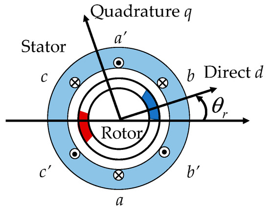 The essential components of a PMSM are a permanent magnet pole rotor and a three-phase winding fixed stator. A rotating magnetic field is produced when a three-phase AC power supply is applied to the stator winding [19]. The magnetic poles on the rotor interact with the revolving magnetic field to produce an electromagnetic torque that excites the rotor to rotate synchronously. The principle of PMSM is shown in Figure 1.