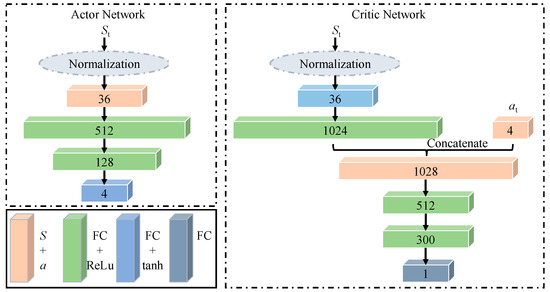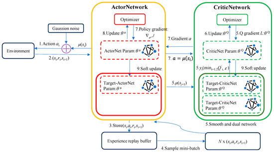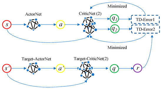 TD3 (Twin Delayed Deep Deterministic Policy Gradient Algorithm), an online off-policy deep RL method that is upgraded with DDPG is utilized to handle continuous control issues [34]. Essentially, the purpose of the TD3 algorithm is to include the Double Q-Learning algorithm into the DDPG algorithm. Combined with the concept of Double DQN, there are six networks in TD3, whose network structure is shown in Figure 7.