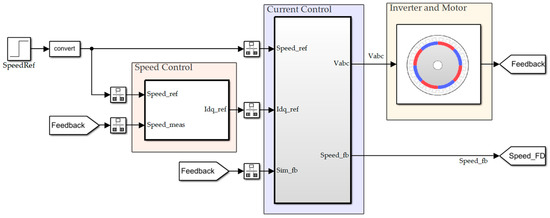 A Simulink model of the FOC control architecture is constructed, as shown below in Figure 9, which includes two control loops: the external speed loop and the internal current loop. The outer ring is realized in the speed control subsystem, while the current ring subsystem mainly changes the speed and torque of the motor by controlling the current of the two axes. Using the output current signal corresponding to the output voltage, the appropriate PWM signal is generated to adjust the semiconductor switch of the inverter, thereby driving the PMSM to achieve the required torque and flux.