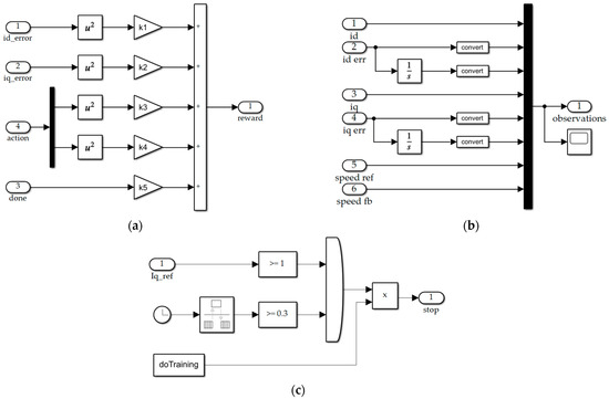 The current loop consists of the following components: three-phase motor current acquisition; Clarke transformation; Park transformation; and a current loop controller (RL controller). This research focuses on the RL controller (shown below in Figure 10), which is primarily made up of external and RL environments. Figure 11 depicts the vector observer (a), reward function (b), and cutoff conditions (c).