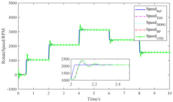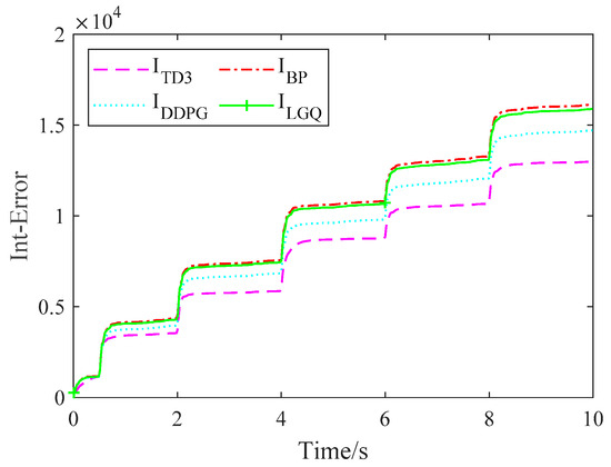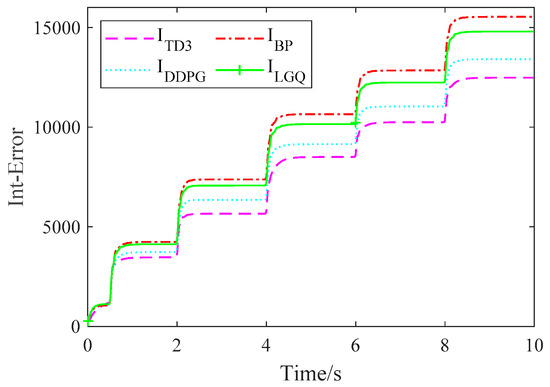 During the initial stage, the speed increased rapidly and steadily (Figure 23). When the rotational speed is stable at 1000 r/min, the overshoot n1 ≈ 100 r/min is reached. When the motor is suddenly loaded with 0.03 N·m, the speed overshoot time of PMSM starting stage under TD3 algorithm is about 0.2 s. When loading, the speed regulation time is about 0.3 s. At this time, the Q-axis current can quickly track the reference signal and reach stability quickly, while the D-axis current is not affected by the Q-axis current and always fluctuates near zero, indicating that the TD3-FOC control has good dynamic steady-state control performance. Figure 24 error integral curve shows the speed tracking effect of the four algorithms.