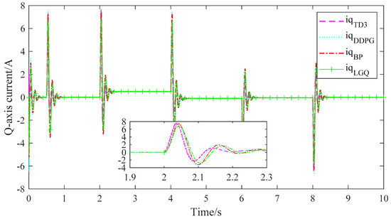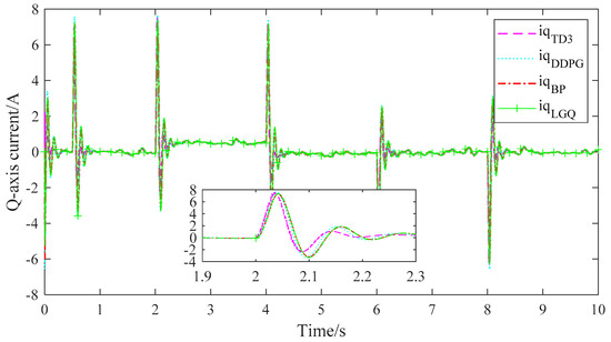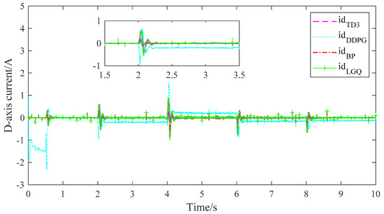 Figure 25 and Figure 26 show the dynamic response process of D-axis and Q-axis current in the speed regulation process of the four algorithms, respectively. As can be seen from the figure, the id and iq fluctuations of TD3-FOC controlled PMSM when the load is applied are smaller than those of the other three algorithms; the experimental results are consistent with the simulation results.